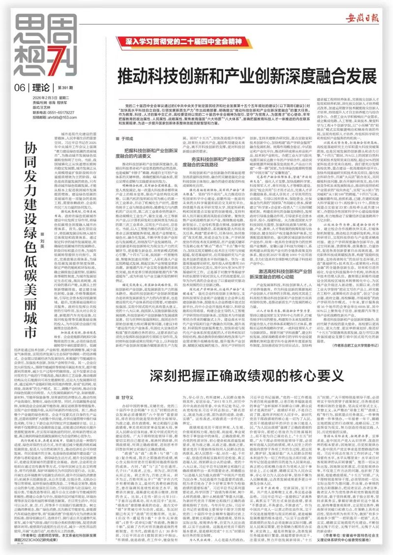 在安徽省“两会”即将召开之际,2月3日《安徽日报》周刊理论版在显著位置刊发校党委书记于祥成署名文章《推动科技创新和产业创新深度融合发展》。文章指出,党的二十届四中全会审议通过的《中共中央关于制定国民经济和社会发展第十五个五年规划的建议》(以下简称《建议》)对加快高水平科技自立自强,引领发展新质生产力”作出战略部署,明确提出“推动科技创新和产业创新深度融合”的重大任务。合肥工业大学坚持以党的二十届四中全会精神为指引,坚守“为党育人、为国育才”初心使命,牢牢把握教育的政治属性、人民属性、战略属性,聚焦教育强国“六大特质”“八大体系”,准确把握教育科技人才一体推进的内在联系和发展规律,为进一步提升国家创新体系整体效能积极贡献智慧和力量。